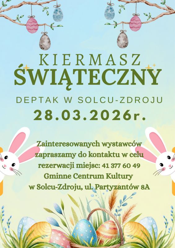 Gminne Centrum Kultury w Solcu-Zdroju zaprasza mieszkańców oraz gości do udziału w Kiermaszu Świątecznym, który odbędzie się 28 marca 2026 roku na deptaku w Solcu-Zdroju.