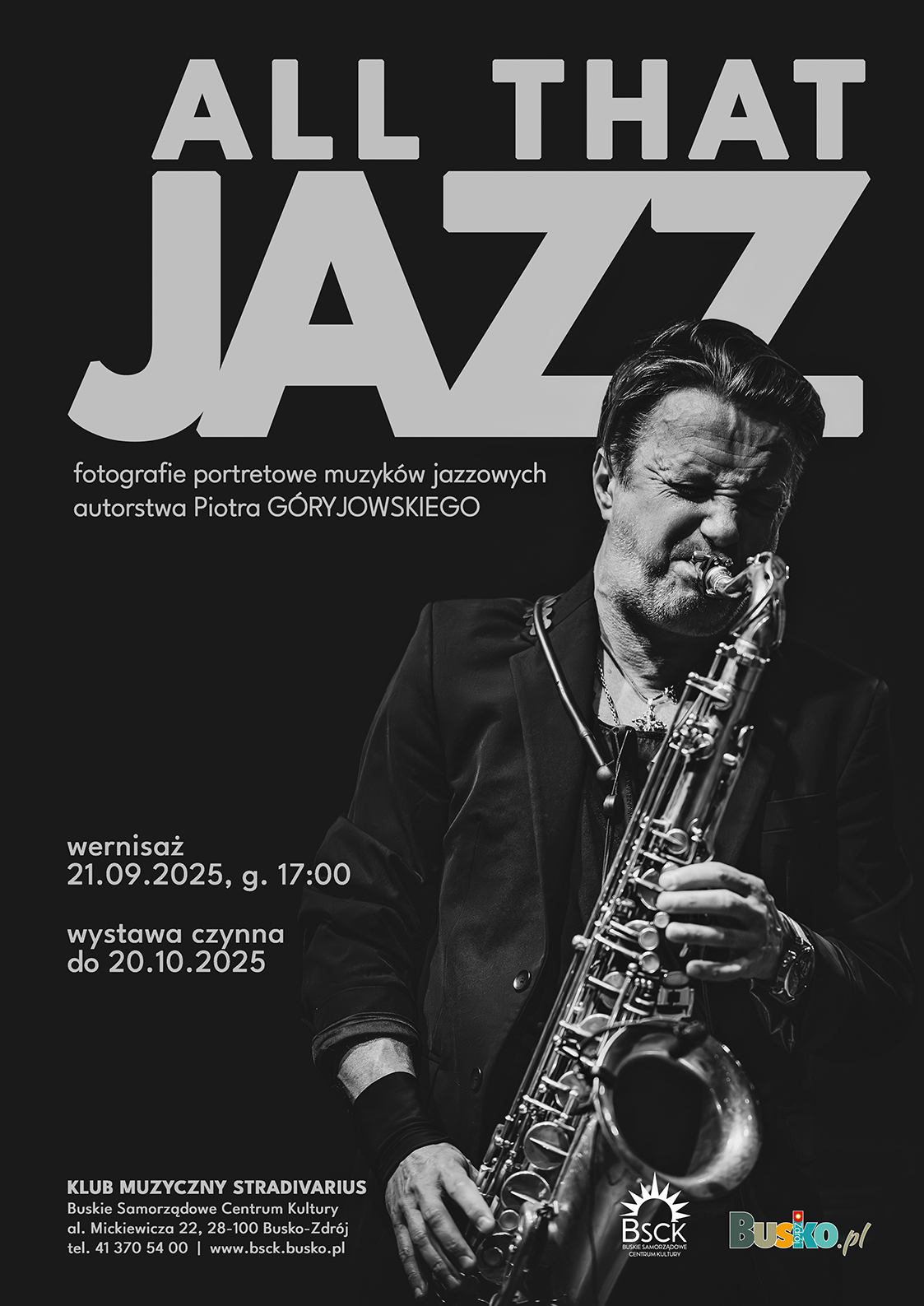 21 września 2025 roku o godzinie 17:00 w klubie Stradivarius Buskiego Samorządowego Centrum Kultury odbędzie się wernisaż wystawy fotografii portretowej muzyków jazzowych autorstwa Piotra Góryjowskiego zatytułowanej 'All That Jazz'. Ekspozycja będzie dostępna dla zwiedzających do 20 października.