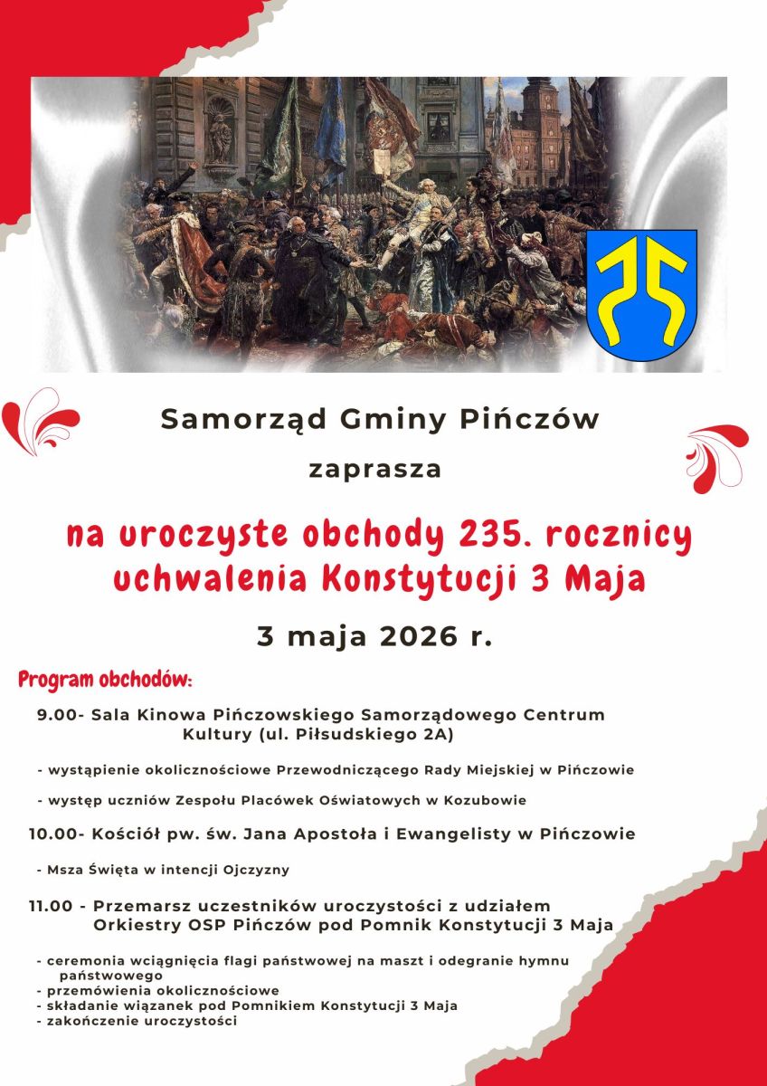 Samorząd Gminy Pińczów przygotował uroczyste obchody 235. rocznicy uchwalenia Konstytucji 3 Maja. Wydarzenia zaplanowane na 3 maja 2026 roku będą miały tradycyjny, podniosły charakter i zgromadzą mieszkańców oraz przedstawicieli lokalnych instytucji.