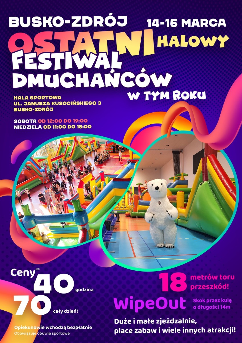 Dmuchane zjeżdżalnie, ogromny tor przeszkód i kolorowe place zabaw - już w najbliższy weekend hala sportowa w Busku-Zdroju zamieni się w prawdziwe centrum dziecięcej rozrywki. Przed najmłodszymi wyjątkowa okazja do aktywnej zabawy - Ostatni Halowy Festiwal Dmuchańców.