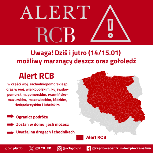Rządowe Centrum Bezpieczeństwa wydało w środę, 14 stycznia 2026 roku, ostrzeżenie dotyczące niebezpiecznych zjawisk pogodowych.