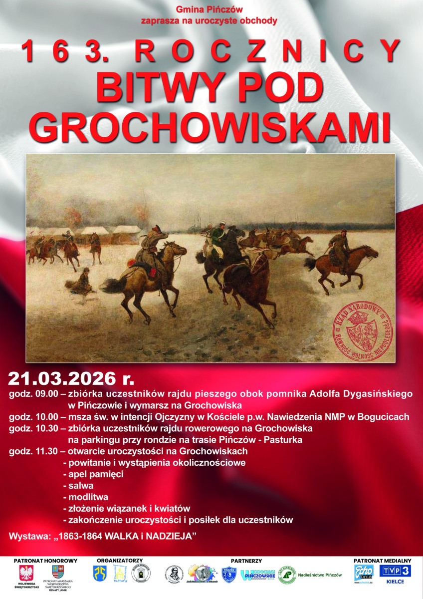 W sobotę, 21 marca 2026 roku odbędą się uroczystości upamiętniające 163. rocznicę Bitwy pod Grochowiskami - jednego z najważniejszych starć Powstania Styczniowego na ziemi świętokrzyskiej. Obchody, organizowane przez Gminę Pińczów, będą okazją do oddania hołdu powstańcom oraz przypomnienia wydarzeń, które na trwałe zapisały się w historii regionu.