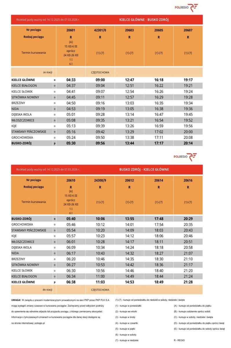 POLREGIO S.A. informuje o zmianie rozkładu jazdy pociągów na trasie Kielce - Busko-Zdrój - Kielce, która obowiązywać będzie od 14 grudnia do 7 marca 2026r. Nowy harmonogram dostosowano do potrzeb podróżnych, wprowadzając modyfikacje w godzinach odjazdów i przyjazdów na poszczególnych przystankach.