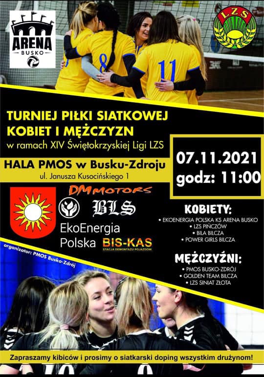 W niedzielę, 7 listopada 2021r. o godz. 11:00 zapraszamy w ramach XIV Świętokrzyskiej Ligi LZS na Turniej Piłki Siatkowej Kobiet i Mężczyzn w Busku-Zdroju na Hali PMOS, przy ulicy J. Kusocińskiego 1.