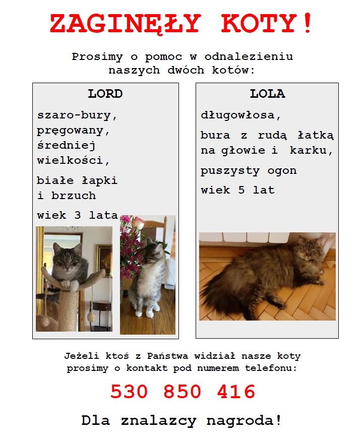 Prosimy o pomoc w odnalezieniu dwóch kotów: LORD - szaro-bury, pręgowany, średniej wielkości, białe łapki i brzuch, wiek 3 lata i LOLA - długowłosa, bura z rudą łatką na głowie i karku, puszysty ogon, wiek 5 lat. Kontakt: 530 850 416. Dla znalazcy nagroda!