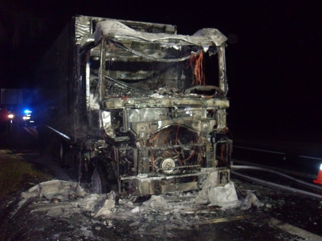 Kierowca opuścił pojazd przed przybyciem jednostek ochrony przeciwpożarowej nie odnosząc żadnych obrażeń ciała. Działania straży pożarnej polegały na zabezpieczeniu terenu akcji, podaniu jednego prądu piany ciężkiej na ognisko pożaru oraz jednego prądu wody w obronie na naczepę. Po zakończonych działaniach gaśniczych, spalony pojazdu sprawdzono kamerą termowizyjną w celu wyeliminowania ukrytych zarzewi ognia.