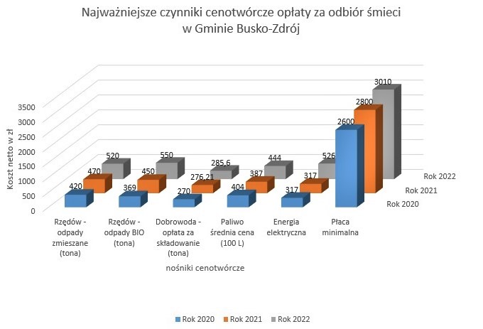 Z pewnością wszyscy dostrzegamy skutki wynikające z wysokiej inflacji a także podwyżek cen energii elektrycznej (o 65,93% w porównaniu do 2021r). Zmianie uległy stawki dla gminy z tytułu składowania odpadów. Wzrosła cena za 1 tonę odpadów transportowanych do Zakładu Gospodarki Odpadami Komunalnymi Sp. z o.o. w Rzędowie, w tym o ponad 22% za 1 tonę odpadów ulegających biodegradacji i o blisko 11% za 1 tonę odpadów zmieszanych. Wzrosły wynagrodzenia pracowników zatrudnionych przy wywozie i segregacji odpadów oraz inne świadczenia pracownicze na które składają się min. koszty ubezpieczeń społecznych, odpis na ZFŚS, środków ochrony osobistej, w tym w związku z przepisami dotyczącymi CoviD. Pojawiła się wyższa płaca minimalna oraz konieczność zwiększenia zatrudnienia. To dodatkowe 7,5 %. Zdrożało również paliwo (netto średnio o ponad 5%).