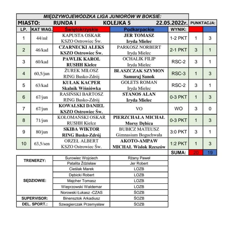 Natomiast w niedzielę rozegrano kolejny mecz bokserski Świętokrzyskie - Podkarpackie w ramach Międzywojewódzkiej Ligi Juniorów w Boksie. Hala Widowiskowo-Sportowa MOSiR przy ul. Żytnia 1 w Kielcach zapełniła się widownią w ramach zmagań bokserskich. Tym razem reprezentacja Świętokrzyskiego wygrała 20:19. Juniorzy z Buska-Zdroju walczyli z bardziej doświadczonymi zawodnikami, a mimo to walki były na wyrównanym poziomie i dały dużo emocji.