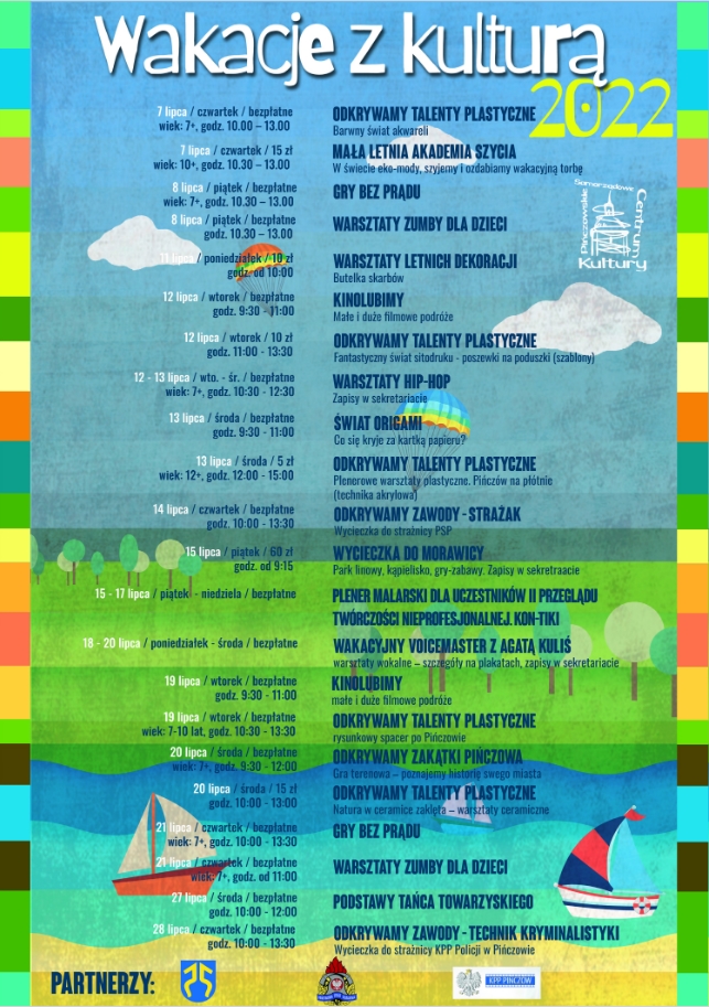 Pińczowskie Samorządowe Centrum Kultury zaprasza na cykl wydarzeń "Wakacje z kulturą". Przed nami dwa miesiące artystycznych zmagań. Będzie twórczo i kreatywnie, a zajęciom przyświecać będzie idea odkrywania. Będziemy odkrywać talenty, poszukiwać pasji, uczyć się nowego, poznawać, a nade wszystko - dobrze się bawić!
