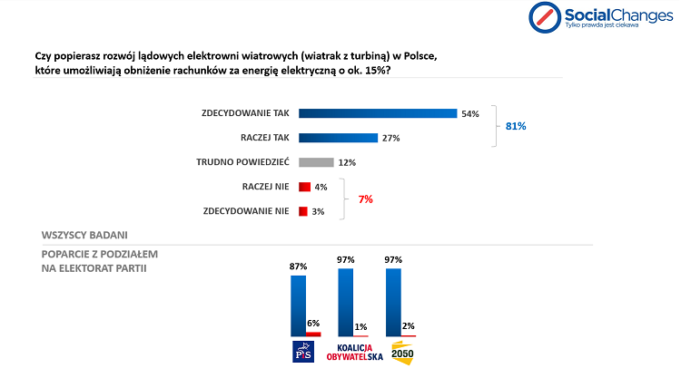 81% Polaków popiera rozwój lądowych elektrowni wiatrowych, 75% uważa, że wiatraki na lądzie przyczyniają się do wzrostu bezpieczeństwa energetycznego i zmniejszenia zależności od paliw kopalnych, a 85% badanych sądzi, że prawo w Polsce powinno wspierać rozwój i korzystanie z odnawialnych źródeł energii, w tym elektrowni wiatrowych - wynika z najnowszego badania Social Changes.