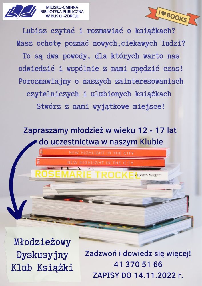 Masz ochotę poznać ciekawych ludzi? To są już dwa powody, dla Których warto odwiedzić Miejsko-Gminną Bibliotekę Publiczną w Busku-Zdroju. Zapraszamy do udziału w Młodzieżowym Dyskusyjnym Klubie Książki.