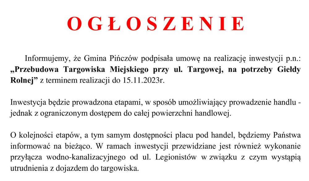 Wodoci±gi Piñczowskie informuj±, ¿e Gmina Piñczów podpisa³a umowê na realizacjê inwestycji p.n.: "Przebudowa Targowiska Miejskiego przy ul. Targowej, na potrzeby Gie³dy Rolnej" z terminem realizacji do 15.11.2023r.