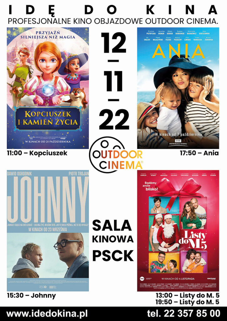 W sobotę 12 listopada najmłodsi obejrzą nowe przygody Kopciuszka. Dla starszych mamy następujące propozycje: „Ania” – inspirująca historię Anny Przybylskiej – odważnej, kochającej życie i spełniającej marzenia dziewczyny z Gdyni. Kolejną propozycją jest emocjonalny rollercoaster, który na przemian bawi i wzrusza, przeraża i rozczula – „Johnny”. I zapowiadająca się na kolejny kinowy hit, w tydzień po ogólnopolskiej premierze „Listy do M. 5”