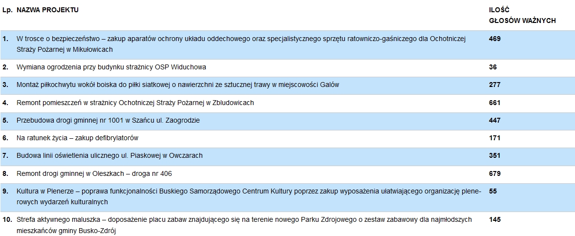 W dniach 11-25 pa¼dziernika 2022 roku przeprowadzono g³osowanie na 10 projektów zg³oszonych przez mieszkañców Miasta i Gminy Busko-Zdrój.