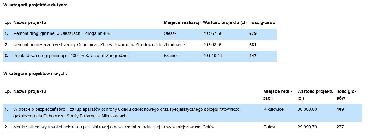 Wyniki bud¿etu obywatelskiego ¶wiadcz± o tym ¿e mieszkañcy wsi obywatelsko podchodz± do tematu, bo mieszkañcy miasta maj± wszystko w pompie. Brawo wie¶, miasto ma jeszcze du¿o do odrobienia.