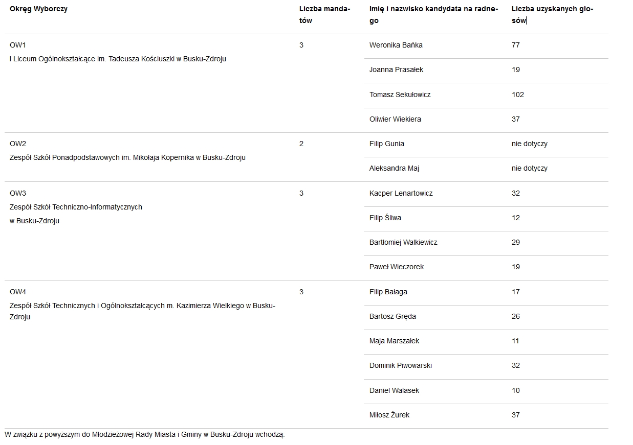Gminna Komisja Wyborcza poinformowa³a o wynikach g³osowania do M³odzie¿owej Rady Miasta i Gminy Busko-Zdrój. O 11 mandatów walczy³o ³±cznie 16 uczniów w 4 okrêgach wyborczych utworzonych w szko³ach ponadpodstawowych.