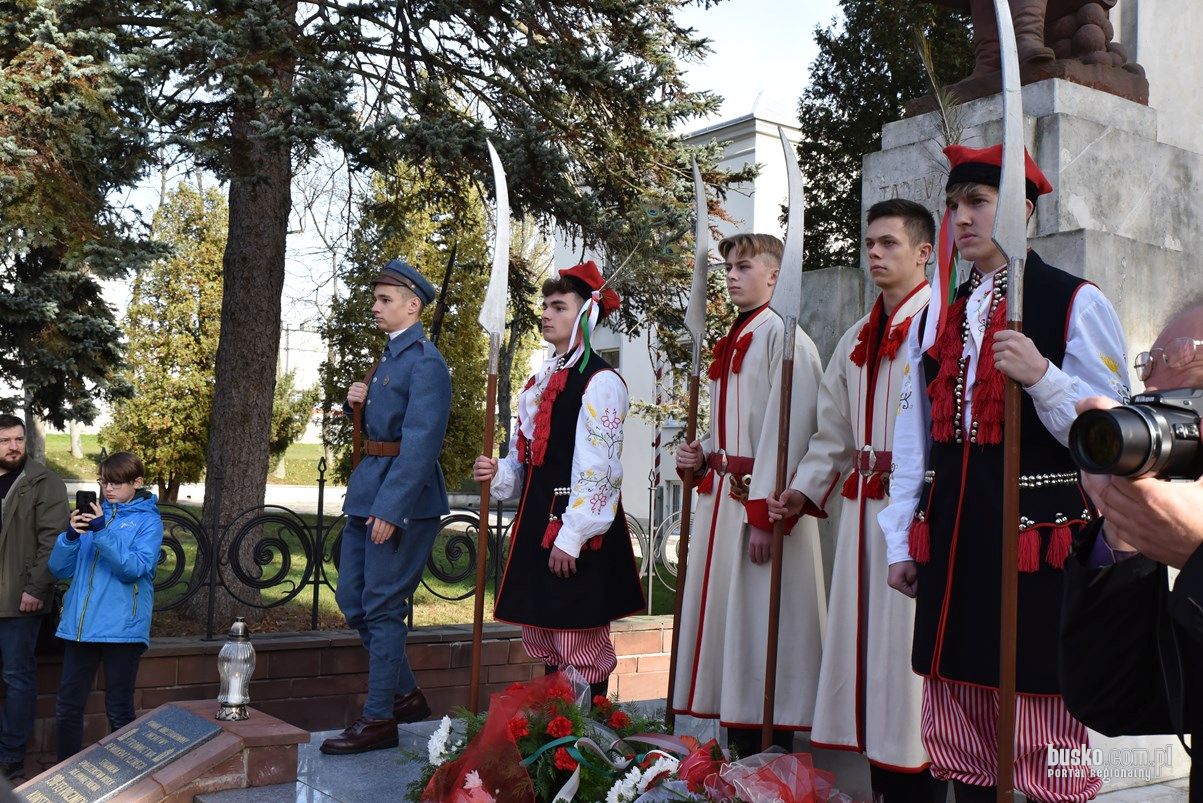 Główna część uroczystości odbyła się tradycyjnie przed pomnikiem Tadeusza Kościuszki, przy al. Mickiewicza. Po wystąpieniu Burmistrza Miasta i Gminy Busko-Zdrój, złożeniu okolicznych wiązanek, uczestnicy obchodów odśpiewali Mazurka Dąbrowskiego w ramach akcji ,,Niepodległa do Hymnu”.