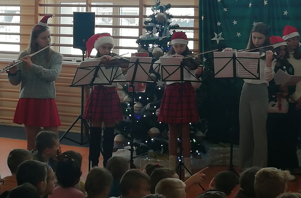 W zimowy poranek, 16 grudnia 2022 r., Publiczną Szkołę Podstawową nr 2 w Busku-Zdroju zaszczycili swoją obecnością uczniowie Szkoły Muzycznej I stopnia im. Krzysztofa Pendereckiego w Busku- Zdroju wraz z prowadzącym Pawłem Koreptą.