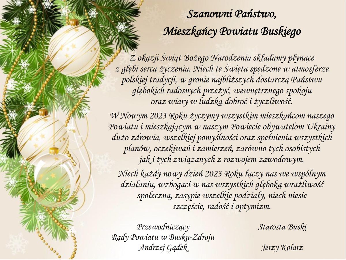 Z okazji Świąt Bożego Narodzenia życzenia płynące z głębi serca składają mieszkańcom powiatu buskiego - Przewodniczący Rady Powiatu w Busku-Zdroju Andrzej Gądek oraz Starosta Buski Jerzy Kolarz.