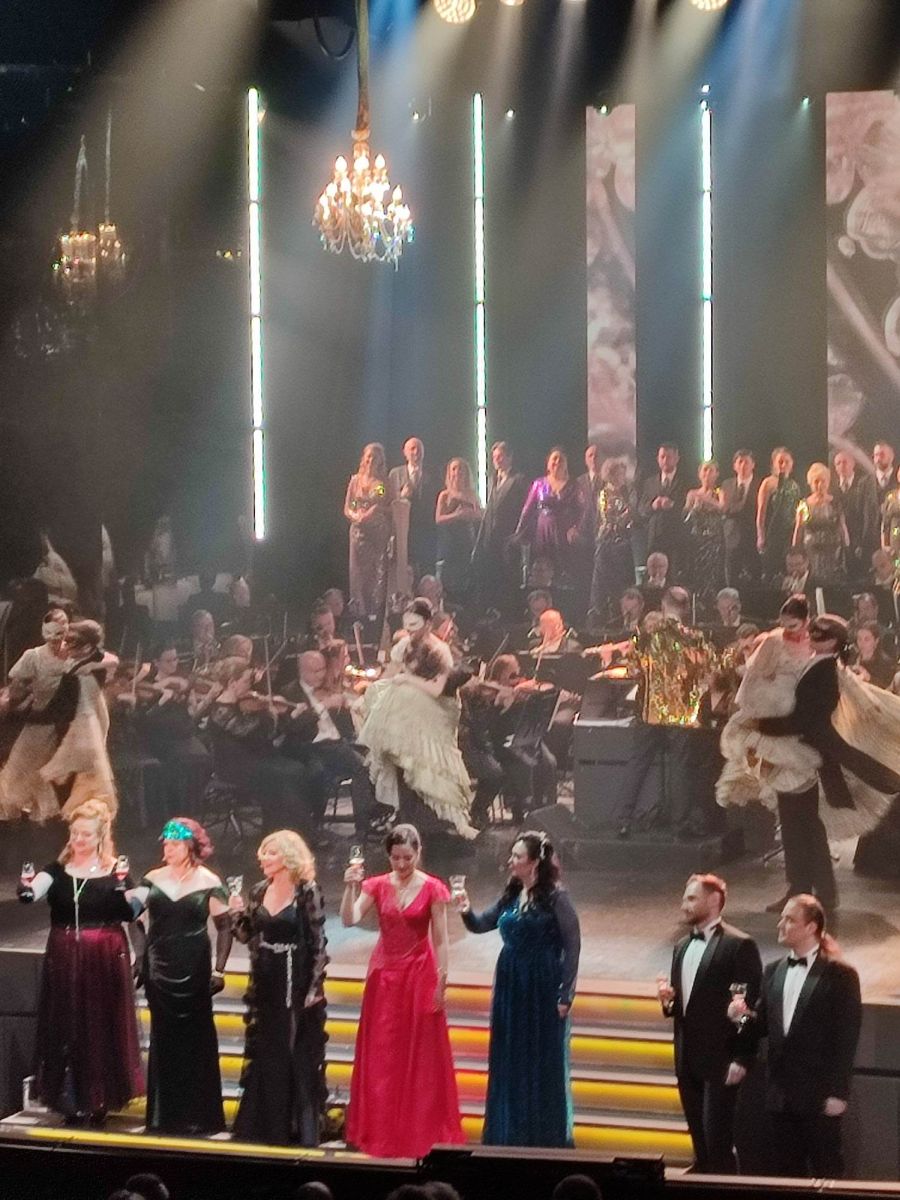 Sala Opery wypełniona po brzegi, a piękne stroje i maski karnawałowe dodawały szczególnego klimatu. Wydarzenie muzyczne w dwóch częściach, odbywało się na trzech poziomach sceny. Rozbudowana orkiestra, chór, balet, dziewięciu solistów, popisy akrobatyczne, scenki rodzajowe, gadżety, stroje z epoki to wszystko wkomponowane w formę zaproszenia na Bal na który zostaliśmy poproszeni.