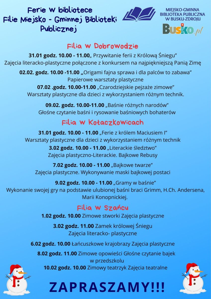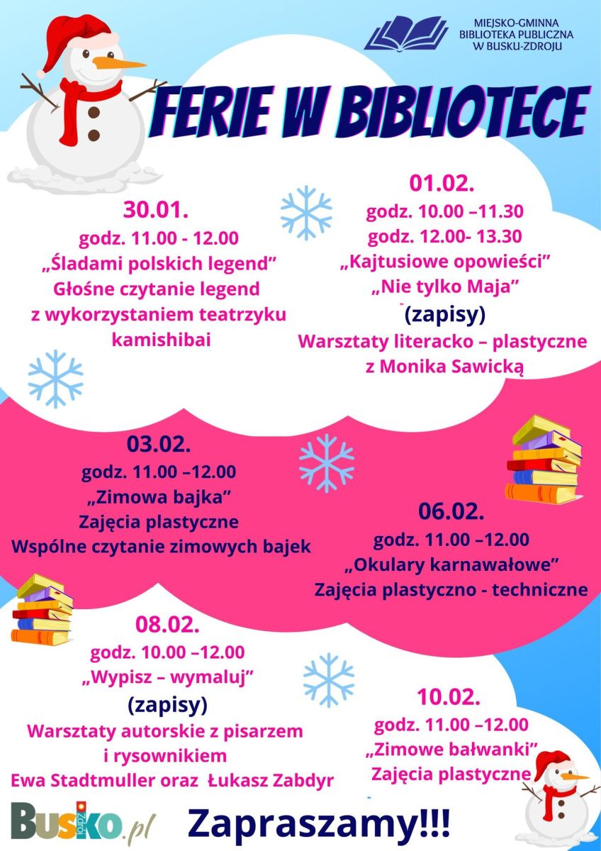 Miejsko-Gminna Biblioteka Publiczna w Busku-Zdroju zaprasza na Ferie do Biblioteki. Nie siedź w domu! Przyjdź do biblioteki! Zapraszamy na warsztaty, wspólne czytanie, zajęcia plastyczne i ciekawe spotkania.