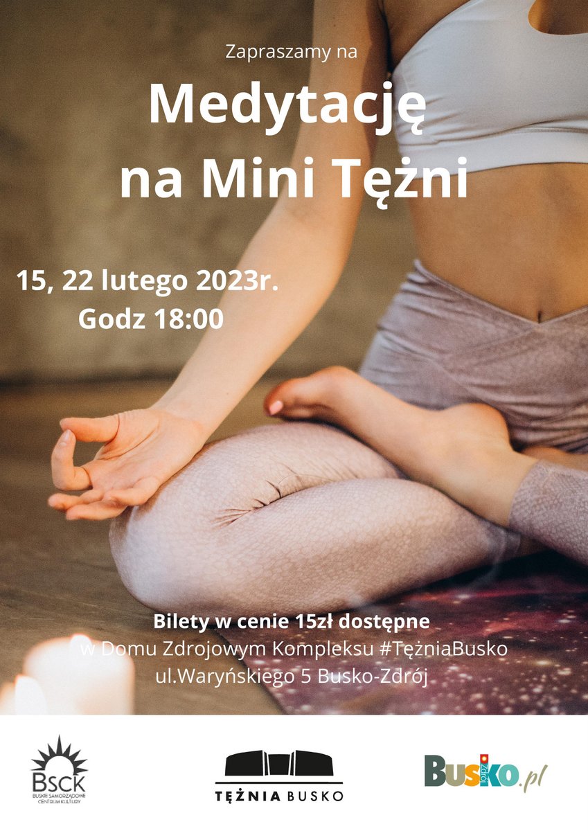 Buskie Samorządowe Centrum Kultury zaprasza do kompleksu #TężniaBusko na spotkania medytacyjne! Zajęcia odbędą się w środy 15 i 22 lutego 2023 o godz. 18:00 w mini tężni w Domu Zdrojowym przy ul. Waryńskiego 5.