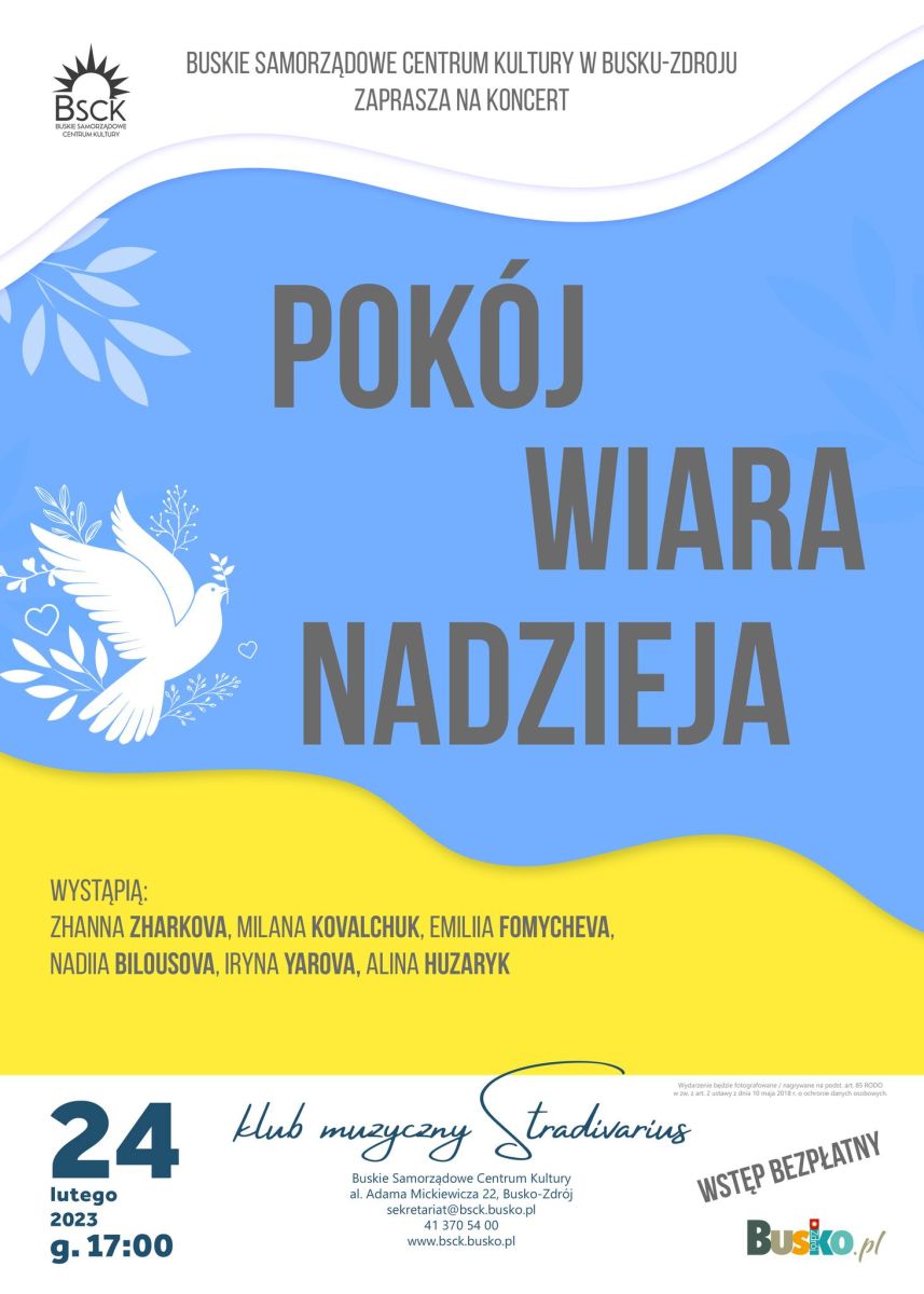 Buskie Samorządowe Centrum Kultury serdecznie zaprasza na koncert "POKÓJ WIARA NADZIEJA". W piątek, 24 lutego o godz. 17:00. Koncert odbędzie się w Klubie Muzycznym Stradivarius BSCK.