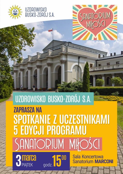 Uzdrowisko Busko-Zdrój S.A. zaprasza na spotkanie z uczestnikami V edycji programu TVP "Sanatorium miłości". Spotkanie odbędzie się w piątek, 3 marca o godzinie 15:00 w Sanatorium "Marconi", poprowadzi je znana z programów telewizyjnych Urszula Rogala.