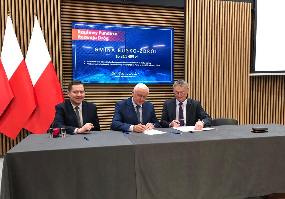 Burmistrz Miasta i Gminy Busko-Zdrój - Waldemar Sikora oraz Skarbnik Miasta i Gminy Busko-Zdrój - Artur Tokarz podpisali z Wojewodą Świętokrzyskim - Zbigniewem Koniuszem umowy na dofinansowanie dwóch projektów w ramach Rządowego Funduszu Rozwoju Dróg.