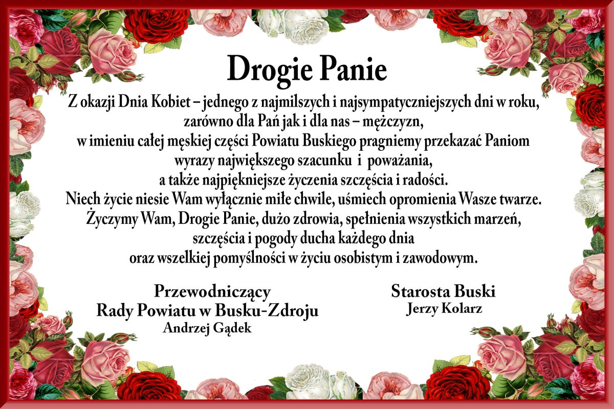 Z okazji Dnia Kobiet - jednego z najmilszych i najsympatyczniejszych dni w roku, zarówno dla Pań jak i dla nas - mężczyzn, w imieniu całej męskiej części Powiatu Buskiego pragniemy przekazać Paniom wyrazy największego szacunku i poważania, a także najpiękniejsze życzenia szczęścia i radości.