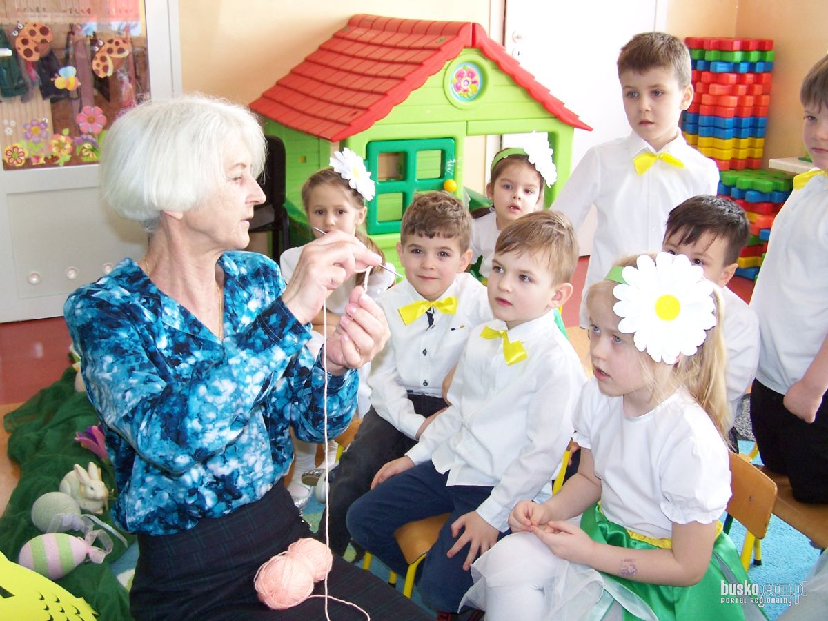Z okazji zbliżających się Świąt Wielkiej Nocy przedszkolaki z grupy III gościły Panią Stenię (babcię Jasia), która w bardzo ciekawy sposób przybliżyła dzieciom symbolikę świat oraz towarzyszące im obyczaje. Dużym zainteresowaniem wśród dzieci cieszy się własnoręcznie wykonane przez Panią ozdoby świąteczne oraz serwety. Chętne przedszkolaki mogły spróbować swoich sił w szydełkowaniu. W ramach podziękowania za wizytę dzieci zaśpiewały piosenki oraz powiedziały wiersze, po czym przystąpiły do samodzielnego wykonania ozdób do koszyczka wielkanocnego.