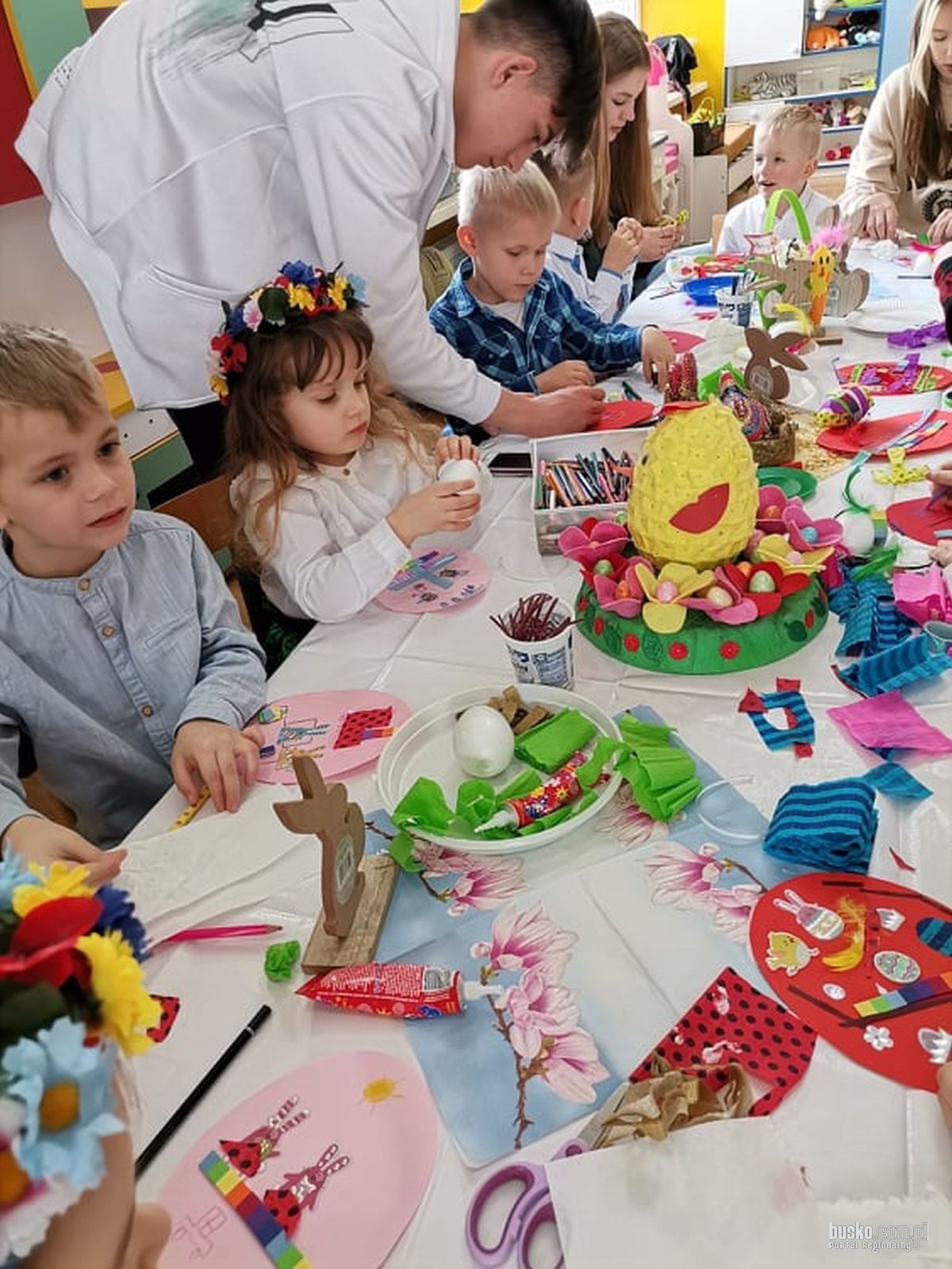 3 kwietnia odbyły się warsztaty plastyczne w grupach I i VII z udziałem Siostry Heleny i uczniów z Zespołu Szkół Ponadpodstawowych im. Mikołaja Kopernika w Busku-Zdroju. Dzieci powitały gości piosenką pt. Zając”. Efektem wspólnych działań były piękne kolorowe prace.