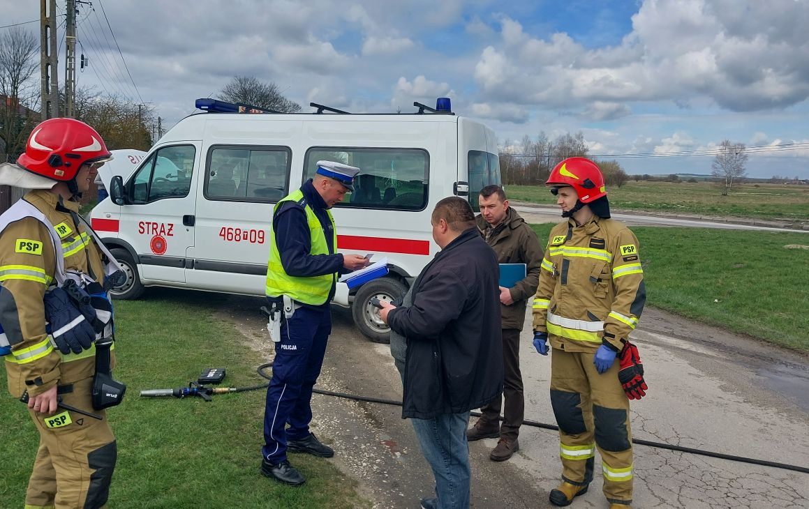 Po przybyciu na miejsce zdarzenia Kierujący Działaniem Ratowniczym ustalił, że samochód typu bus, którym podróżował tylko kierowca wypadł z drogi i uderzył w słup telefoniczny. Ranny kierowca przebywał w pojeździe. Działania strażaków polegały na zabezpieczeniu miejsca zdarzenia, udzieleniu pomocy medycznej poszkodowanemu oraz ograniczeniu skutków zdarzenia poprzez zebranie rozbitych elementów i rozlanych płynów eksploatacyjnych z pojazdu.