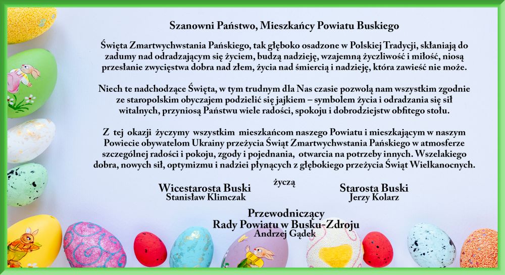 Szanowni Państwo, Mieszkańcy Powiatu Buskiego, Święta Zmartwychwstania Pańskiego, tak głęboko osadzone w Polskiej Tradycji, skłaniają do zadumy nad odradzającym się życiem, budzą nadzieję, wzajemna życzliwość i miłość, niosą przesłanie zwycięstwa dobra nad złem, życia nad śmiercią i nadzieję, która zawieść nie może.