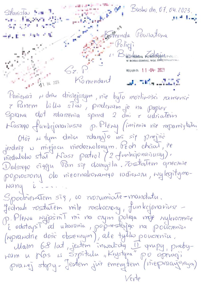 Ponieważ w dniu dzisiejszym, nie było możliwości zamienić z Panem kilku słów, przelewam je na papier. Sprawa dot zdarzenia sprzed 2 dni z udziałem Waszego funkcjonariusza p. Plewy (imienia nie zapamiętałem).