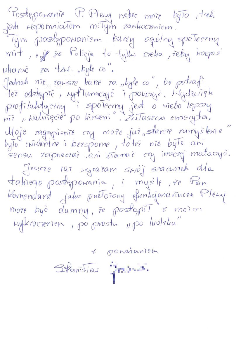 Jeszcze raz wyrażam swój szacunek dla takiego postępowania i myślę, że Pan Komendant jako przełożony funkcjonariusza Plewy może być dumny, że postąpił z moim wykroczeniem, po prostu „po ludzku”.