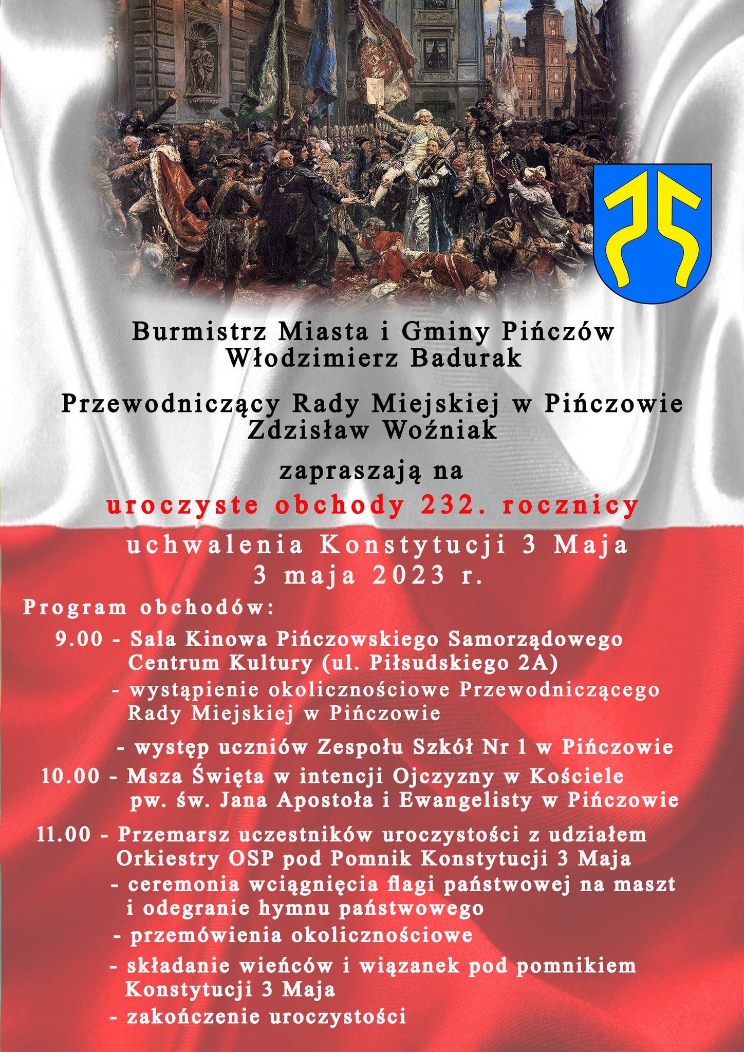 Burmistrz Miasta i Gminy Pińczów Włodzimierz Badurak oraz Przewodniczący Rady Miejskiej w Pińczowie Zdzisław Woźniak zapraszają na uroczyste obchody 232. rocznicy uchwalenia Konstytucji 3 Maja.