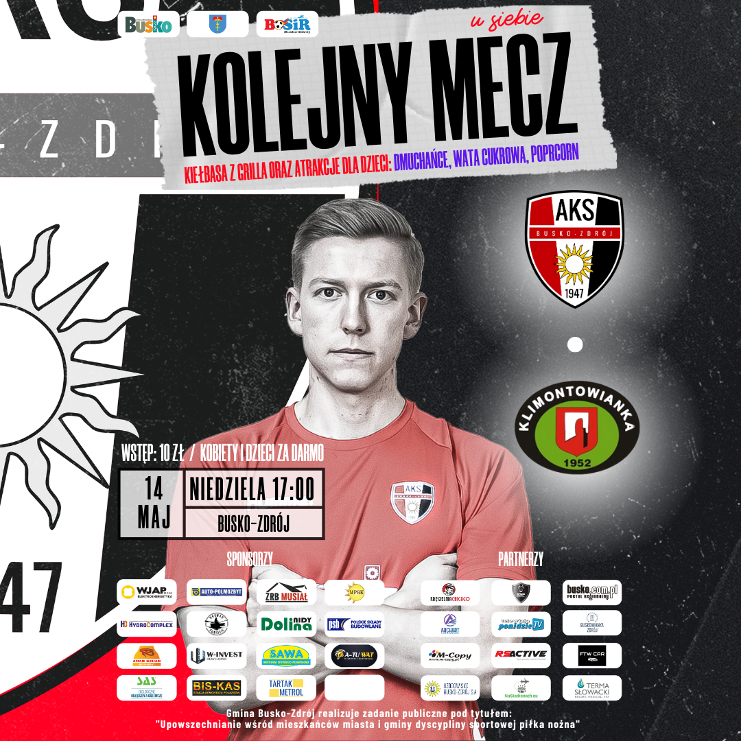 W niedzielę, 14 maja o godz. 17:00 w ramach 28 kolejki Hummel IV Ligi AKS 1947 Busko-Zdrój podejmie na własnym boisku drużynę Klimontowianka PBI Klimontów.