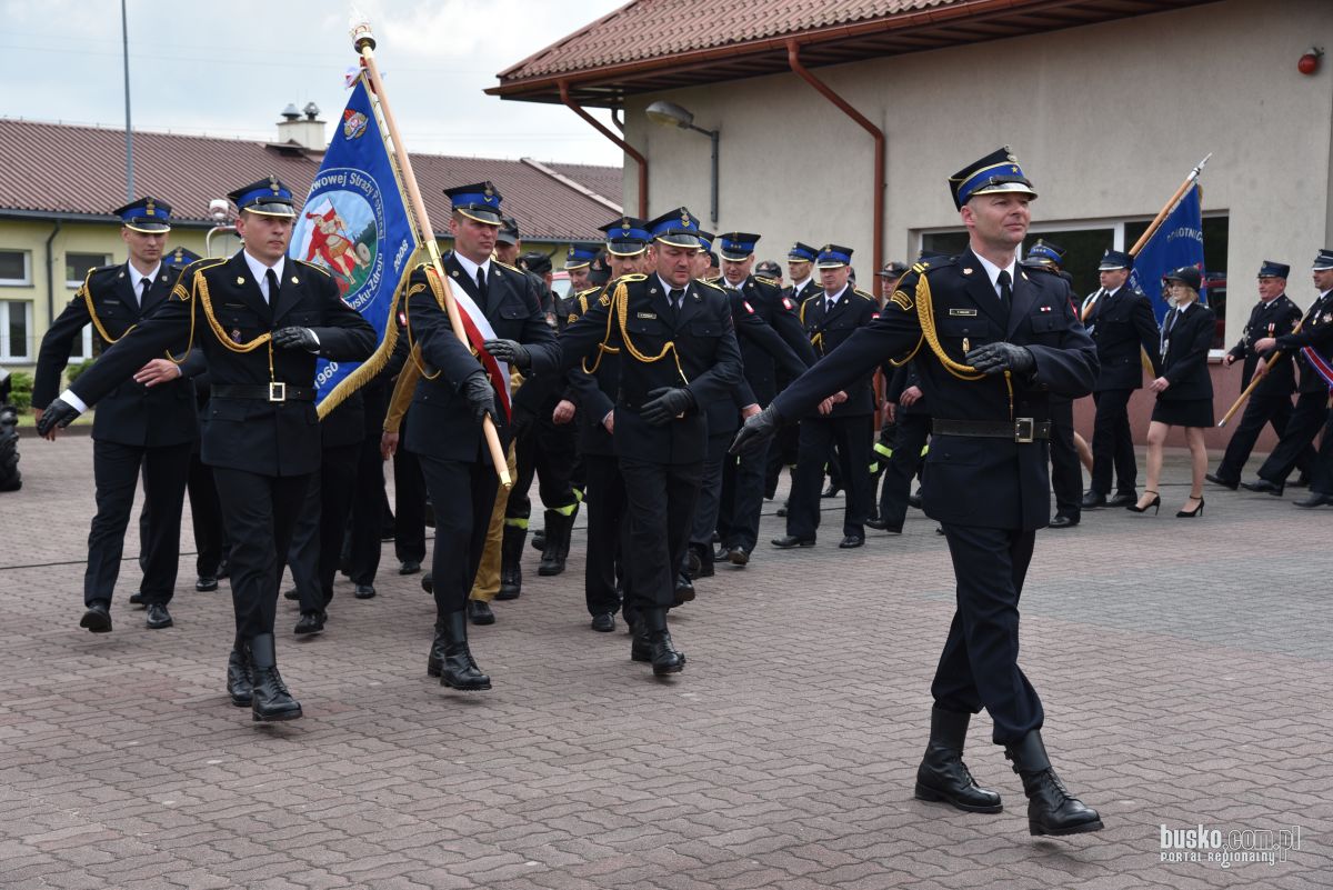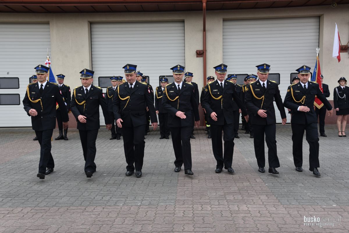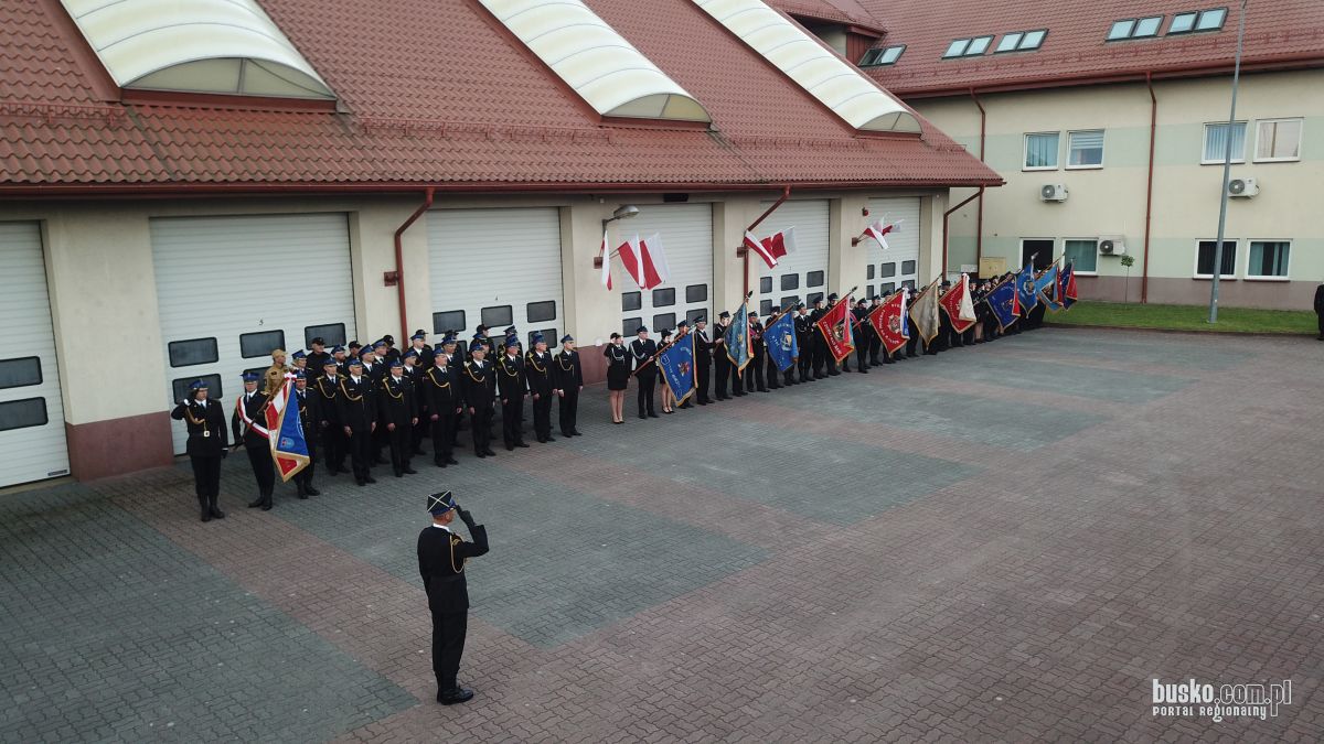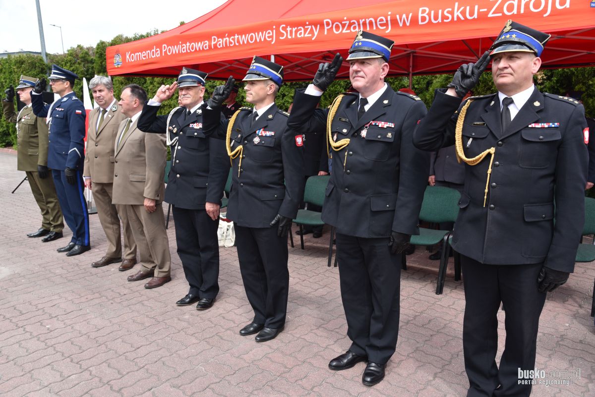Uroczysty apel rozpoczął się od złożenia meldunku przez dowódcę uroczystości kpt. Sebastiana Machnickiego, Zastępcy Świętokrzyskiego Komendanta Wojewódzkiego PSP st.bryg. Arturowi Brachowiczowi, po czym nastąpił przegląd pododdziału w skład którego wchodzili buscy strażacy oraz poczty sztandarowe jednostek OSP z terenu powiatu buskiego.