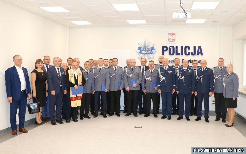 W wydarzeniu udział wzięli: Komendant Wojewódzki Policji w Kielcach nadinsp. dr Jarosław Kaleta, Komendant Powiatowy Policji w Kazimierzy Wielkiej nadkom. Tomasz Zwolski oraz jego Pierwszy Zastępca – nadkom. Marcin Ciszek, kadra kierownicza kazimierskiej jednostki oraz zaprzyjaźnione służby mundurowe. Podczas uroczystości nie zabrakło także obecności przedstawicieli lokalnych władz samorządowych.