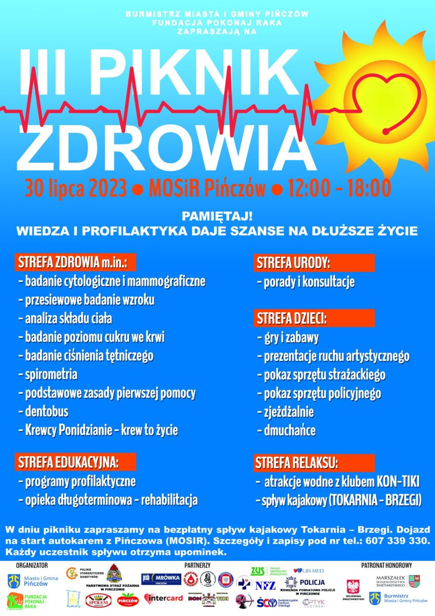 Na półmetku wakacji, dokładnie 30 lipca, od godziny 12:00 do 18:00, Gmina Pińczów i Fundacja "Pokonaj raka" mają przyjemność zaprosić wszystkich na III Piknik Zdrowia. To niezwykłe wydarzenie, które łączy w sobie relaks, zabawę i troskę o zdrowie. Już teraz warto zarezerwować czas na udział w tej niezapomnianej imprezie!