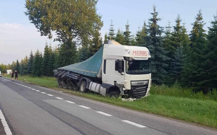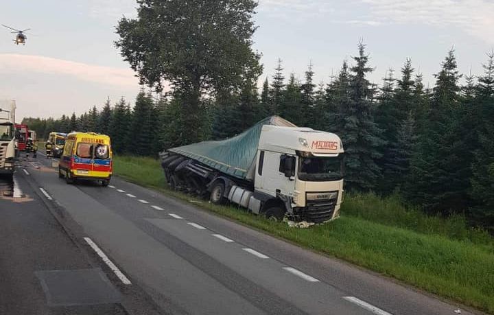 Droga krajowa numer 73 była zablokowana w obu kierunkach. Jeden z ciężarowych pojazdów zjechał częściowo do rowu, a naczepa przewróciła się na bok.