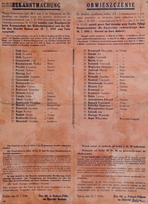 W zbiorach Instytutu Pamięci Narodowej znajduje się obwieszczenie niemieckie z 18 lipca 1944 r. Zawiera ono nazwiska 45 mieszkańców Kreishauptmannschaft Busko skazanych przez okupanta niemieckiego na karę śmierci. Niemal wszyscy z nich byli zaangażowani w działalność Armii Krajowej lub Batalionów Chłopskich. W obwieszczeniu możemy przeczytać, iż: