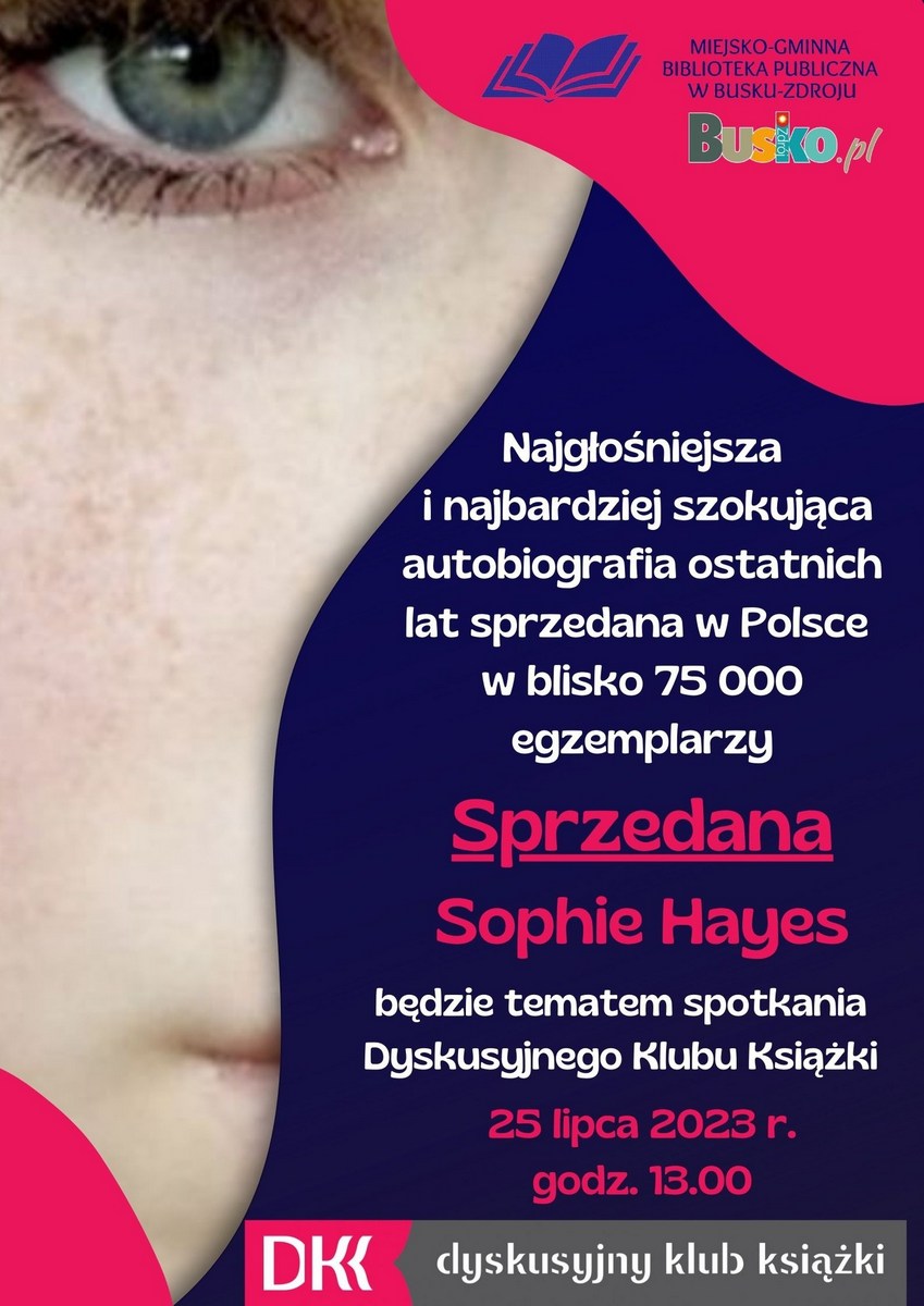 Dyskusyjny Klub Książki zaprasza na kolejne spotkanie do Miejsko-Gminnej Biblioteki Publicznej w Busku-Zdroju, które odbędzie się w najbliższy wtorek, 25 lipca o godzinie 13:00. Tym razem uczestnicy klubu będą mieli okazję porozmawiać o książce "Sprzedana" autorstwa Sophie Hayes - najgłośniejszej i najbardziej szokującej autobiografii ostatnich lat.