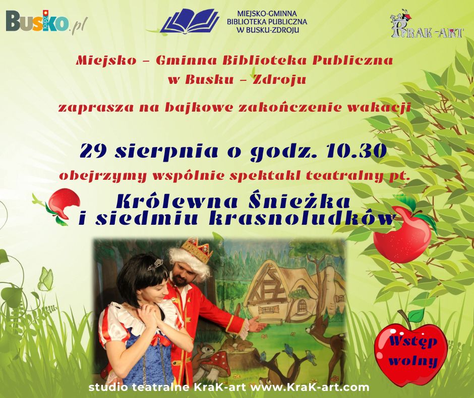 Czas szybko mija, a wakacyjne przygody powoli dobiegają końca. Jednak niech smutek przed nadejściem września zostanie na boku, ponieważ Miejsko-Gminna Biblioteka Publiczna w Busku-Zdroju przygotowała dla Was bajkowe zakończenie wakacji. Już 29 sierpnia 2023 r. o godzinie 10:30 zapraszamy na spektakl teatralny "Królewna Śnieżka i Siedmiu Krasnoludków"!