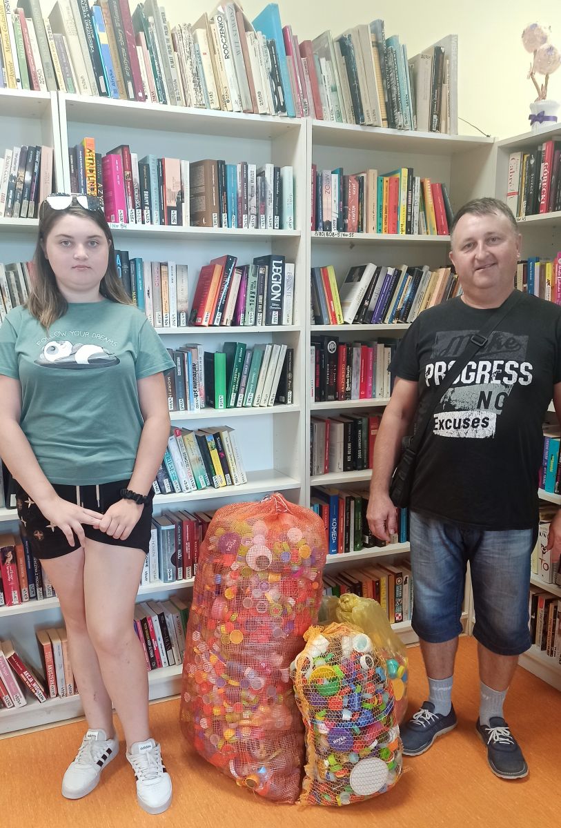 Cegiełkę do tej akcji dołożył 23 sierpnia 2023 roku również Pan Tomasz z córką Andżeliką, przywożąc ze sobą kilkadziesiąt kilogramów plastikowych nakrętek, zebranych przez siebie i znajomą - panią Ewelinę. Jak przyznał Pan Tomasz, nakrętki zbierał przez dłuższy czas i bardzo się cieszy, że chociaż w ten sposób może pomóc chłopcu.