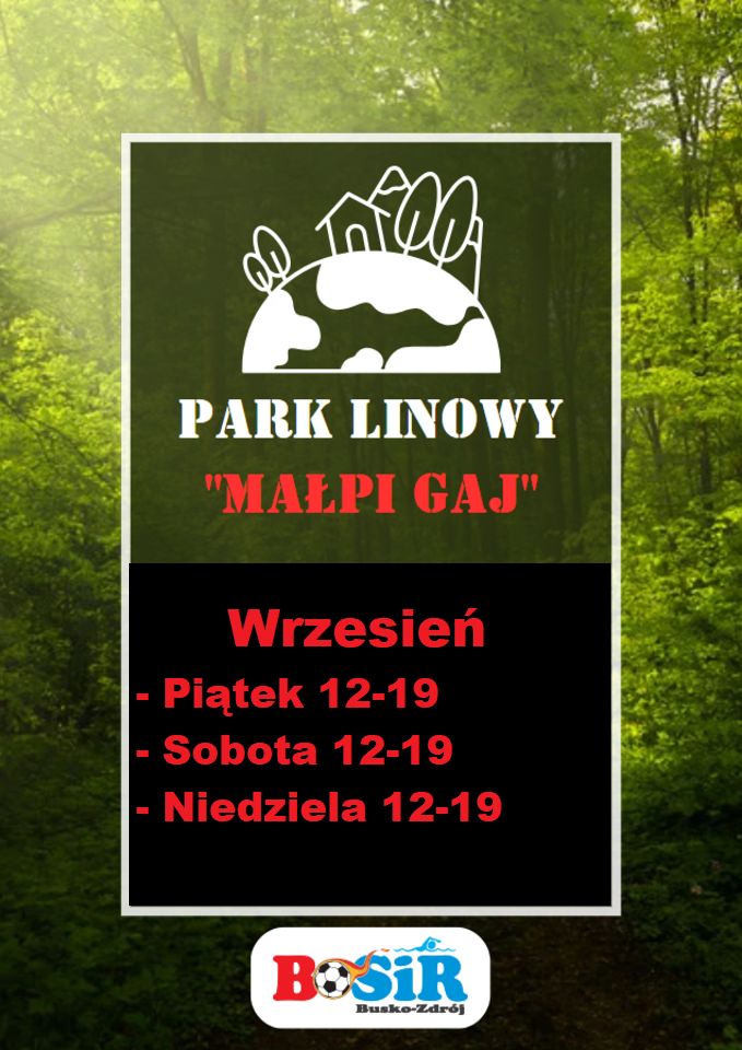 Buski Ośrodek Sportu i Rekreacji informuje wszystkich mieszkańców i odwiedzających o zmianie godzin funkcjonowania Parku Linowego "Małpi Gaj", aby dostosować się do zbliżającego się końca lata i zmieniających się warunków pogodowych.