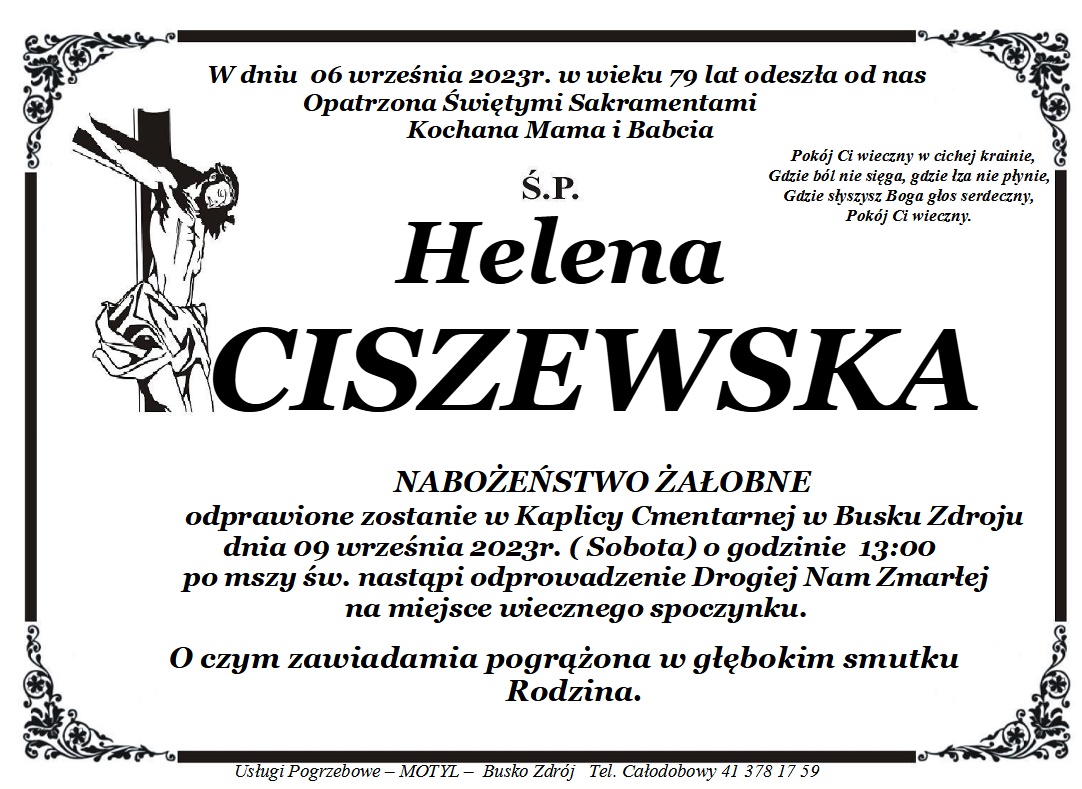 najbliższym, oraz podzielić się słowami wsparcia i otuchy. Szczere wyrazy współczucia kierujemy do Redaktora Naczelnego naszego Portalu Marka Ciszewskiego, syna Pani Heleny.