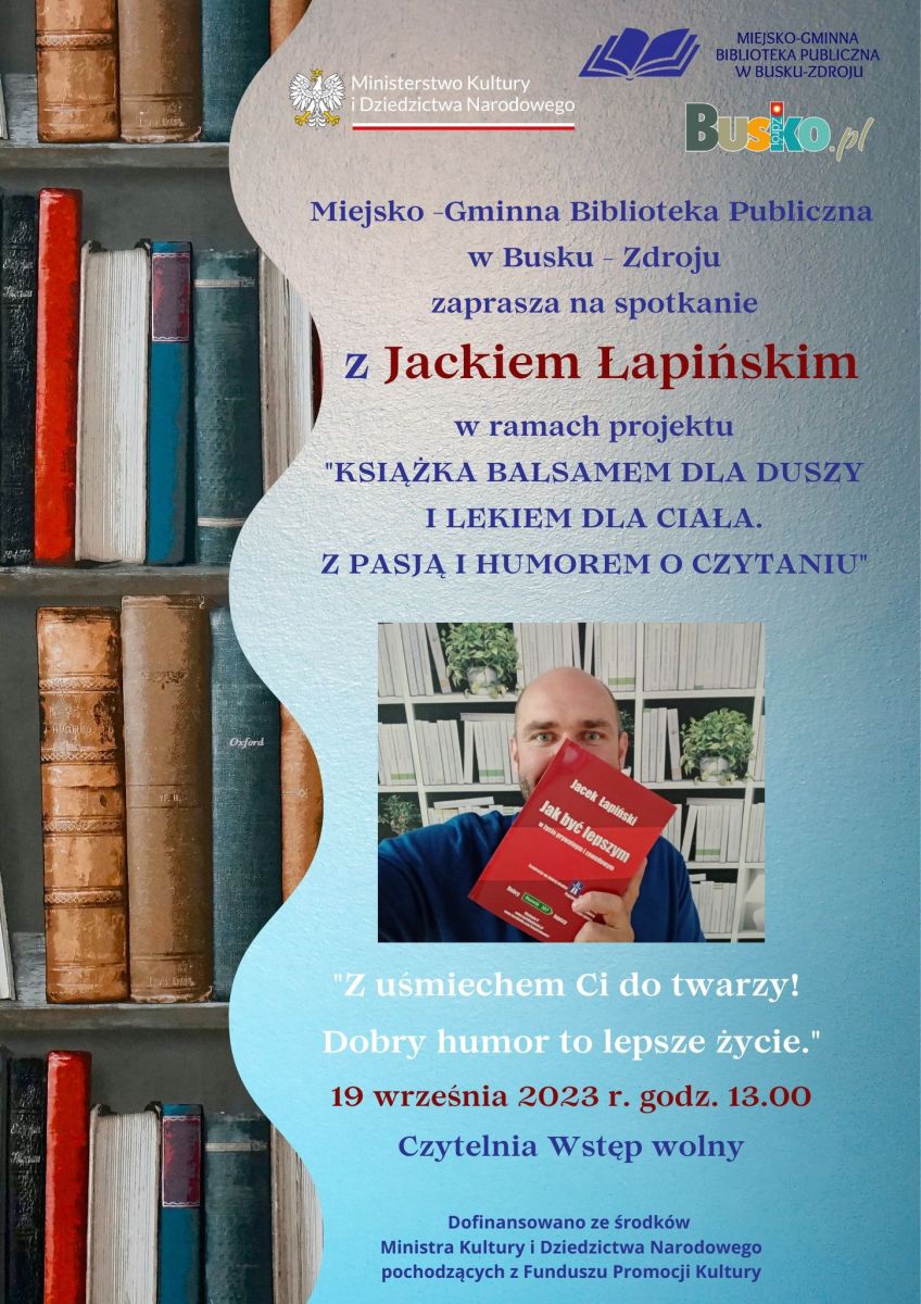 Miejsko-Gminna Biblioteka Publiczna w Busku-Zdroju serdecznie zaprasza nie tylko miłośników literatury na spotkanie z Jackiem Łapińskim, które odbędzie się w ramach projektu "KSIĄŻKA BALSAMEM DLA DUSZY I LEKIEM DLA CIAŁA. Z PASJĄ I HUMOREM O CZYTANIU".
