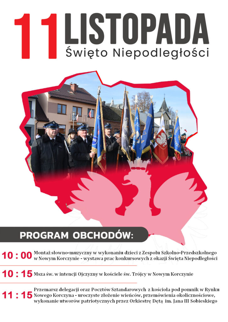 Burmistrz Miasta i Gminy Nowy Korczyn, Pawe³ Zagaja oraz Przewodnicz±ca Rady Miejskiej, Kazimiera Go³dyn maj± zaszczyt zaprosiæ na uroczyste obchody 105 Rocznicy Odzyskania Niepodleg³o¶ci, które odbêd± siê dnia 11 listopada 2023 roku w Nowym Korczynie.